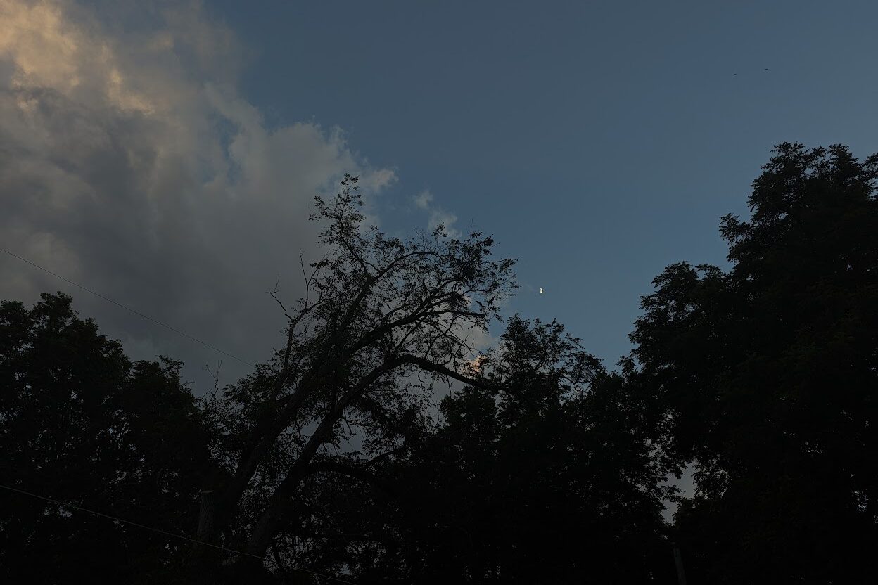 An evening sky. Tree tops frame a deep blue with gray clouds. A tiny crescent moon glows in the background.